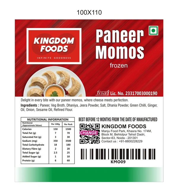 Soft paneer filled momos, 25g each, 40 pcs frozen pack.