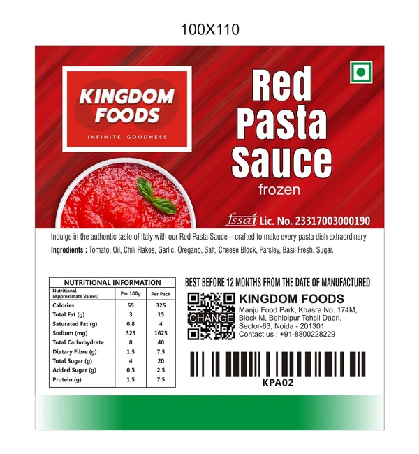 Red Pasta Sauce- Tangy, rich and perfectly seasoned, this Italian-style red pasta sauce delivers authentic tomato flavour with aromatic herbs. Ready to eat and made with care using ripe tomatoes, it’s trusted for its freshness and quality. Keep frozen below –18°C to maintain freshness. Shelf life: 1 year. Follow our regeneration process for the best taste experience.